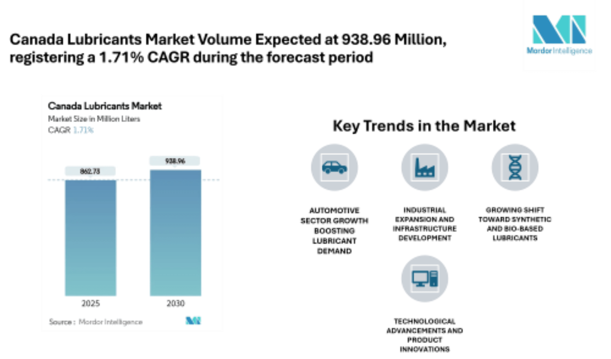 Canada Lubricants Market is projected to grow from 862.73 million liters in 2025 to 938.96 million liters by 2030, registering a 1.71% CAGR during the forecast period. This growth reflects rising demand across the automotive, industrial, and construction sectors, as well as a steady shift toward high-performance and eco-friendly lubricants to improve equipment efficiency and meet evolving industry standards.