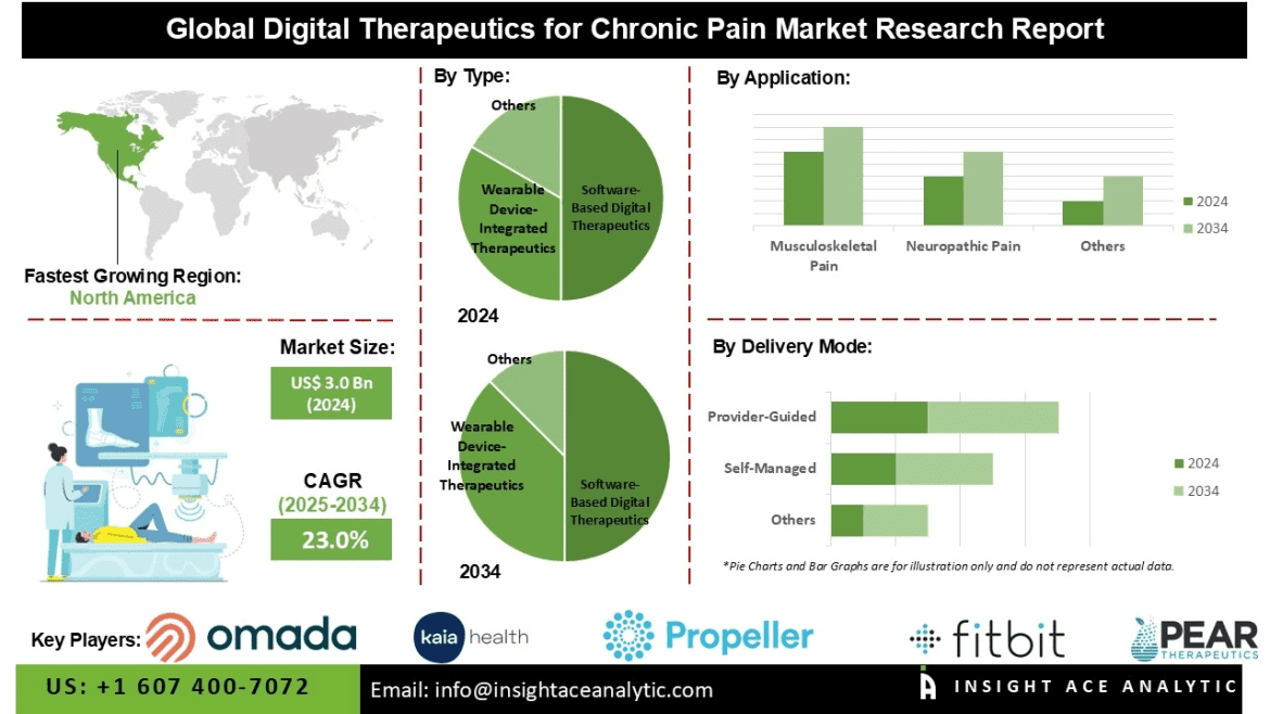 InsightAce Analytic Pvt. Ltd. announces the release of a market assessment report on the “Global Digital Therapeutics for Chronic Pain Market Size, Share & Trends Analysis Report By Type (Software-Based Digital Therapeutics, Mobile Application Therapeutics, and Wearable Device-Integrated Therapeutics), Delivery Mode (Self-Managed and Provider-Guided), Application (Neuropathic Pain, Musculoskeletal Pain, Fibromyalgia, and Post-Surgical Pain), End-use (Patients and Healthcare Providers),-Market Outlook And Industry Analysis 2034″