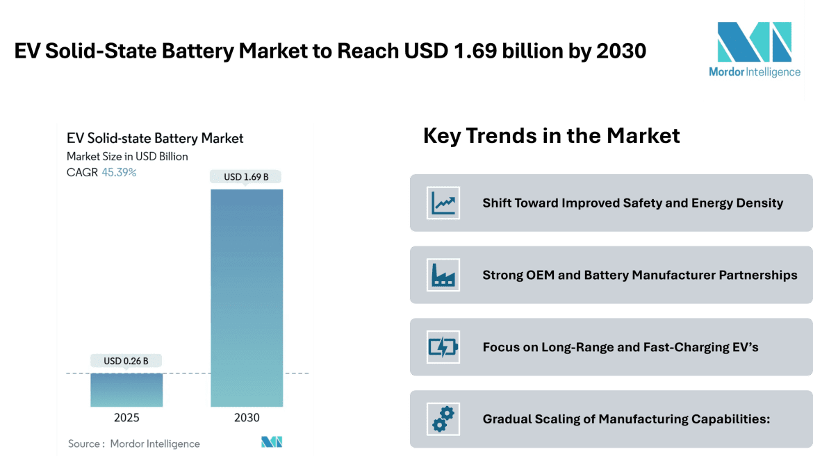 EV Solid-State Battery Market to Reach USD 1.69 billion by 2030, Driven by Safety-Focused Designs and OEM Integration – Mordor Intelligence