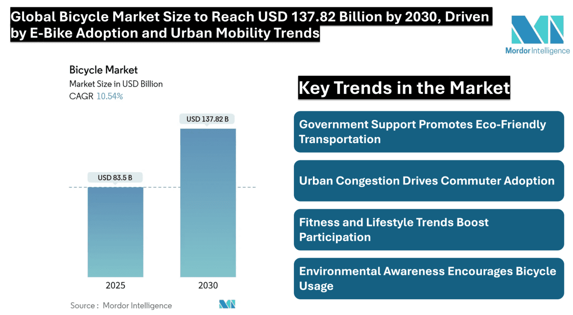 The global bicycle market size is estimated at USD 83.50 billion in 2025 and is expected to reach USD 137.82 billion by 2030, growing at a CAGR of 10.54%. Growth is supported by urban congestion policies, corporate wellness initiatives, government investments in cycling infrastructure, rising fuel costs, and technological advancements in battery safety. Direct-to-consumer brands, software-enabled fleet services, and e-bike innovations are transforming the market landscape, making bicycles an increasingly viable and sustainable transportation option.