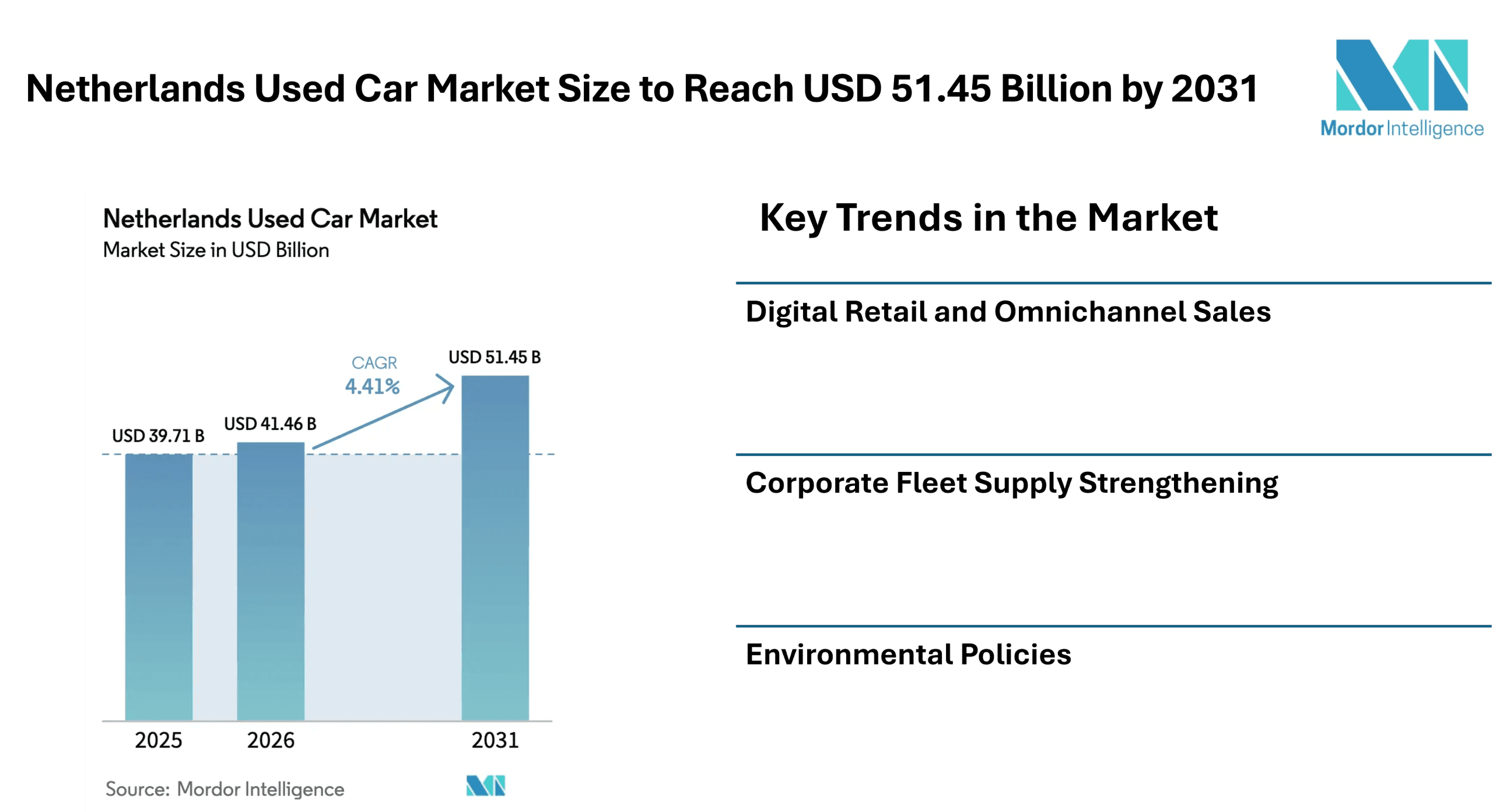 According to Mordor Intelligence, the Netherlands used car market size was valued at USD 39.71 billion in 2025 and is expected to reach USD 41.46 billion in 2026, with projections indicating the market could reach USD 51.45 billion by 2031. This outlook reflects stable demand across passenger vehicle categories and an active resale ecosystem supported by digital platforms and organized dealer networks.